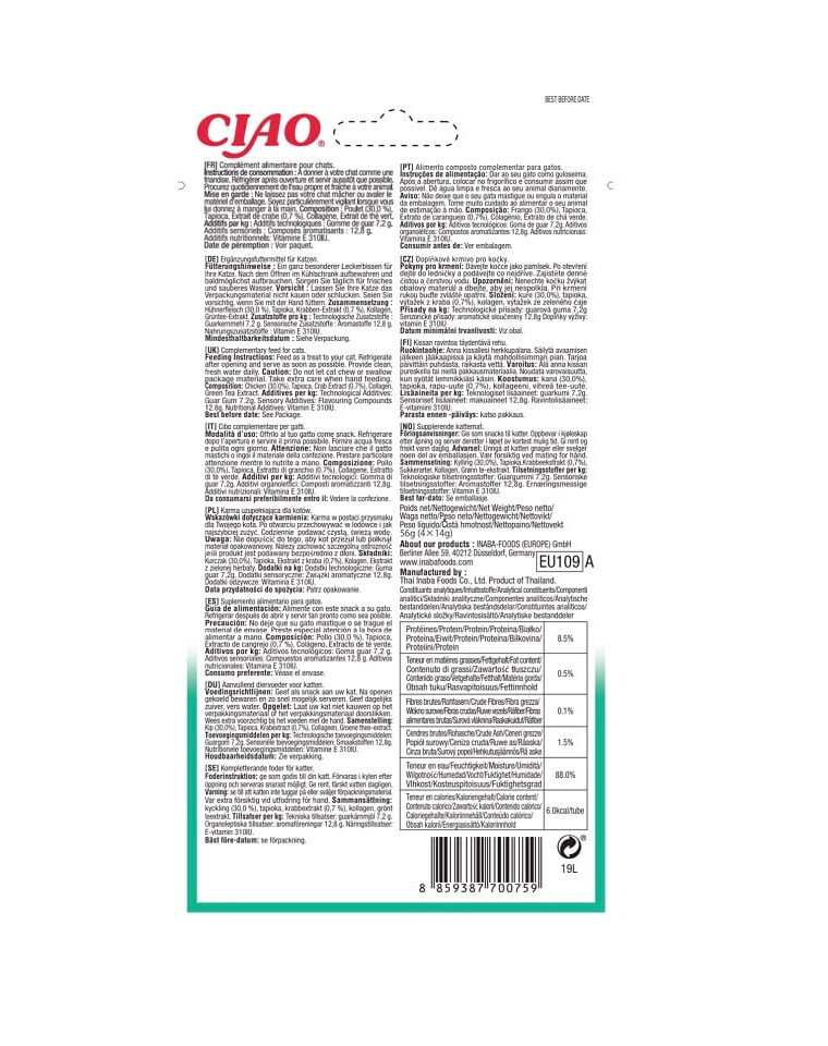 Poulet (30,0 %), tapioca, extrait de crabe (0,7 %), collagène, extrait de thé vert.