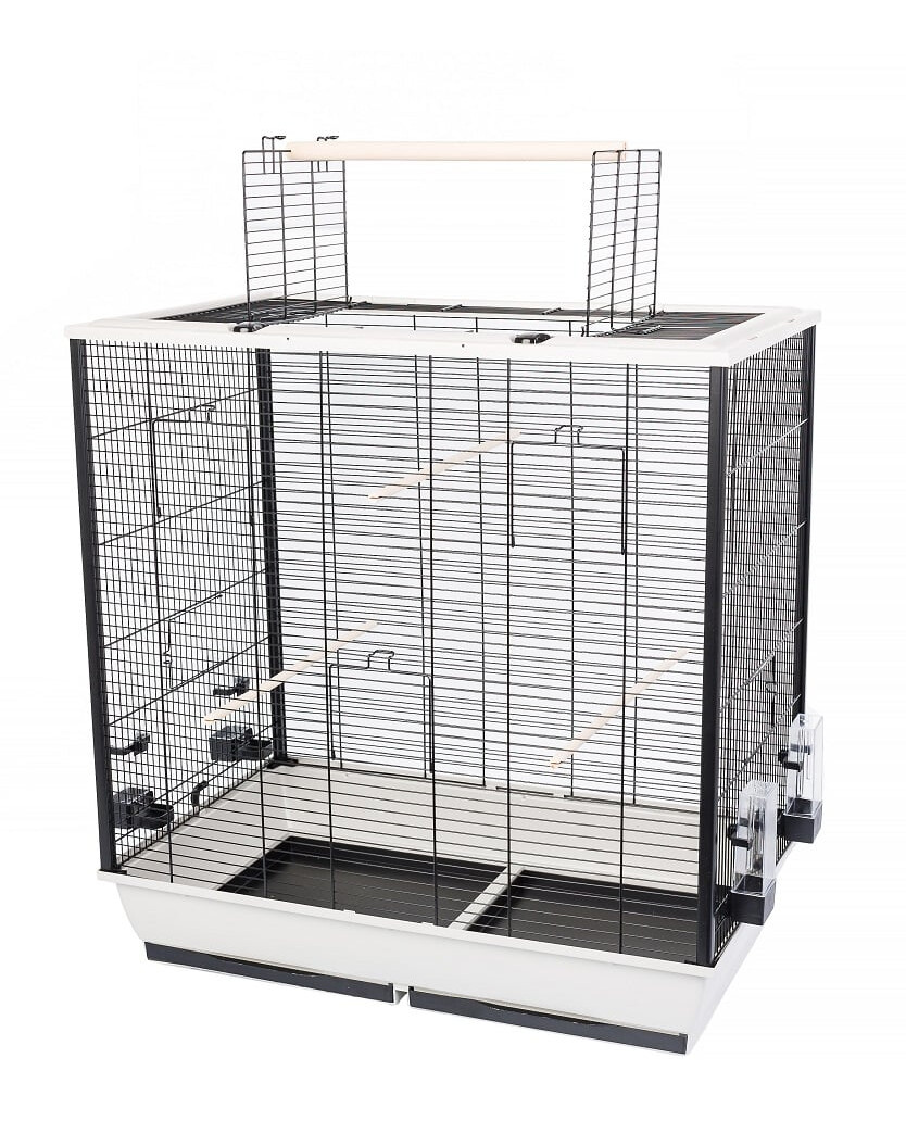 Cage à oiseaux. Équipée de 4 grandes mangeoires et de 4 perchoirs, qui sont des éléments essentiels d'une cage à oiseaux. Ils permettent à l'oiseau de se reposer et de jouer, et peuvent également servir de point d'attache pour un jouet ou un accessoire. La cage est également équipée d'un bac à litière profond avec deux tiroirs, ce qui facilite l'élimination des déchets et le nettoyage du bac.