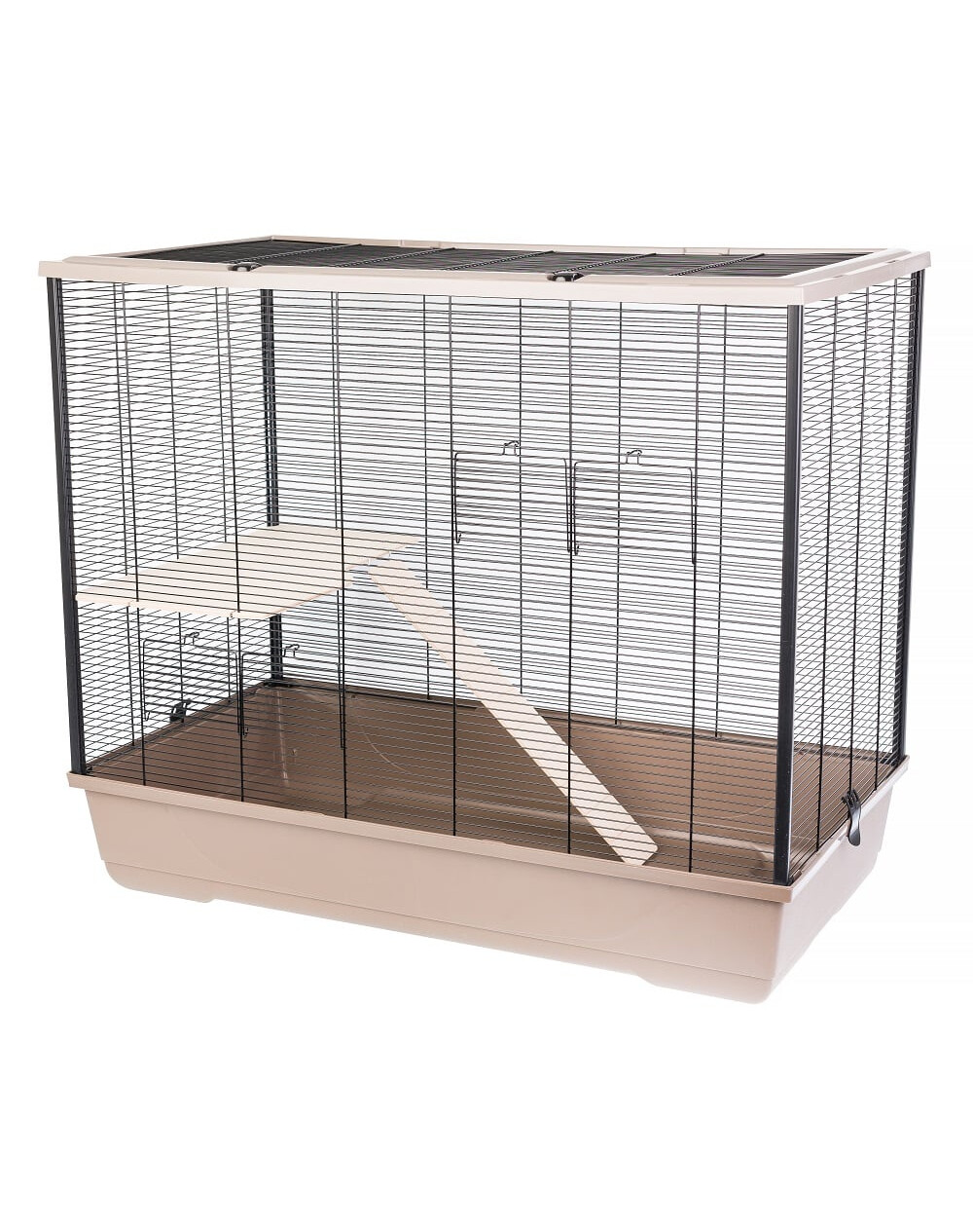 Cage spacieuse pour rongeurs. Elle est équipée d'un plancher, d'une étagère en bois à mi-hauteur de la cage et d'une échelle en bois permettant d'y accéder. Cela permet de mieux utiliser l'espace de la cage et d'augmenter l'espace de jeu et de repos des animaux. Le bac à litière de la cage est profond afin que la sciure de bois ne se répande pas à l'extérieur du bac.