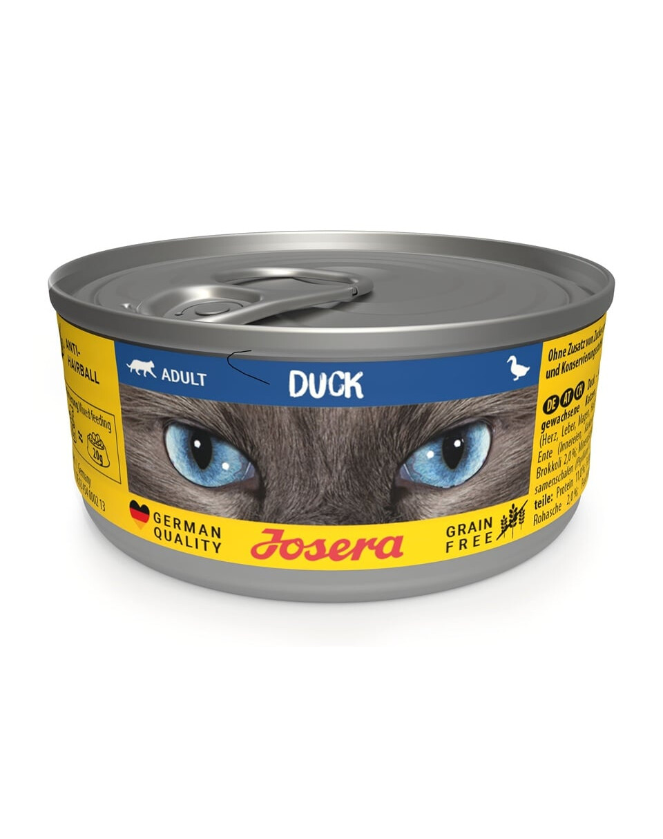 Quand votre animal mange avec plaisir, son gardien est également satisfait. C'est une autre raison de veiller à une délicieuse variété dans son alimentation – par exemple en choisissant notre nouvelle nourriture humide Josera Duck en boîte ! Le goût du canard incitera même les chats les plus difficiles à manger. La nourriture Duck en boîte fournit aux chats une plus grande quantité de liquide, ce qui est précieux pour les chats qui n'aiment pas boire de l'eau.