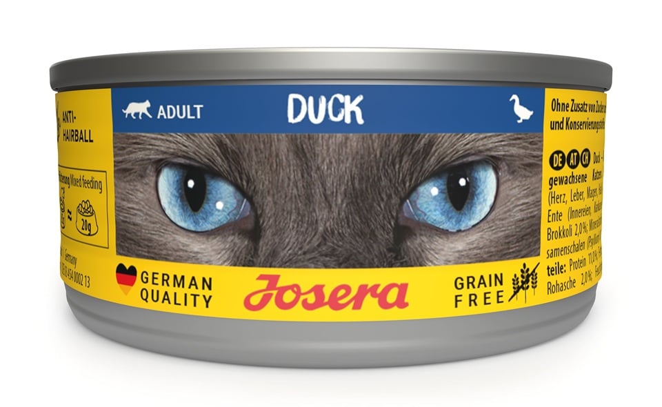 Quand votre animal mange avec plaisir, son gardien est également satisfait. C'est une autre raison de veiller à une délicieuse variété dans son alimentation – par exemple en choisissant notre nouvelle nourriture humide Josera Duck en boîte ! Le goût du canard incitera même les chats les plus difficiles à manger. La nourriture Duck en boîte fournit aux chats une plus grande quantité de liquide, ce qui est précieux pour les chats qui n'aiment pas boire de l'eau.