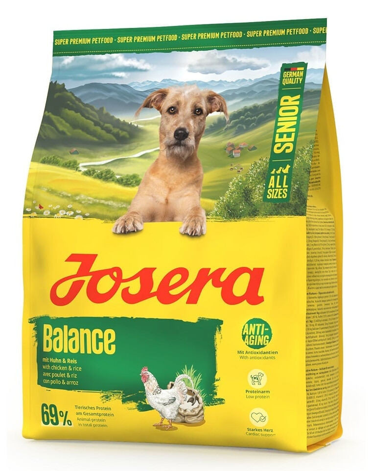 JOSERA Senior Balance sont des croquettes complètes, faibles en matières grasses et en protéines, à base de poulet et de riz pour les chiens âgés ayant des besoins énergétiques réduits