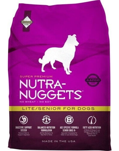 NUTRA NUGGETS Lite Senior est un aliment complet et parfaitement équilibré pour les chiens âgés de plus de 7 ans et pour les chiens en surpoids. Cet aliment unique contient de la glucosamine et de la chondroïtine, qui veillent au bon état des articulations des animaux âgés.