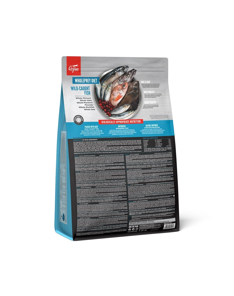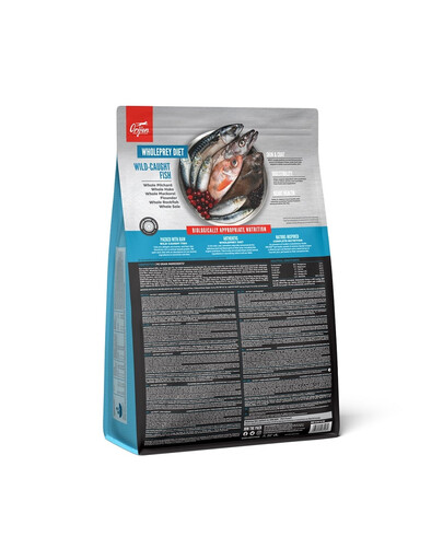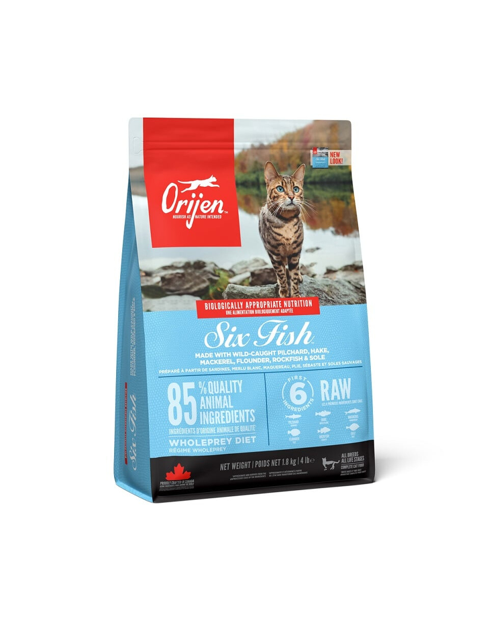 Il est plein de protéines nutritives provenant de 6 types de poissons pêchés dans la nature. Les ingrédients sont fournis frais tous les jours et ajoutés aux aliments dans des proportions nutritives. Cette formule contient une quantité limitée de graisses et de glucides et un mélange unique de fibres de citrouille et de pomme, garantissant une condition optimale pour tous les chats adultes. La formulation de l'aliment est basée sur le régime ancestral des chats et sur des années de recherche. Une teneur élevée en protéines animales (85 %) fournit les acides aminés et autres nutriments les mieux absorbés et les plus rapides. Les 2/3 des ingrédients sont propres à la consommation humaine, avec seulement une transformation douce dans l'aliment et le 1/3 restant déshydraté à 90*.