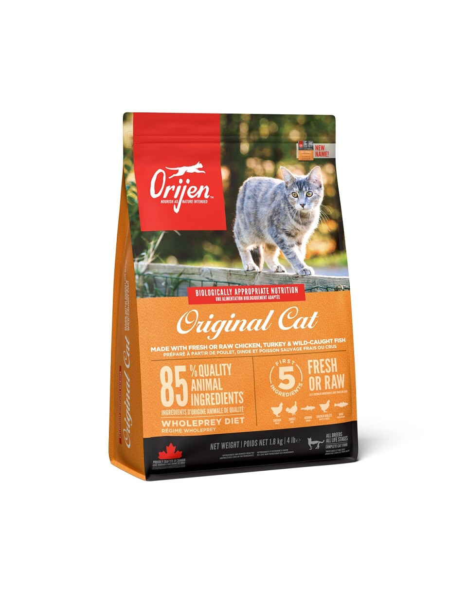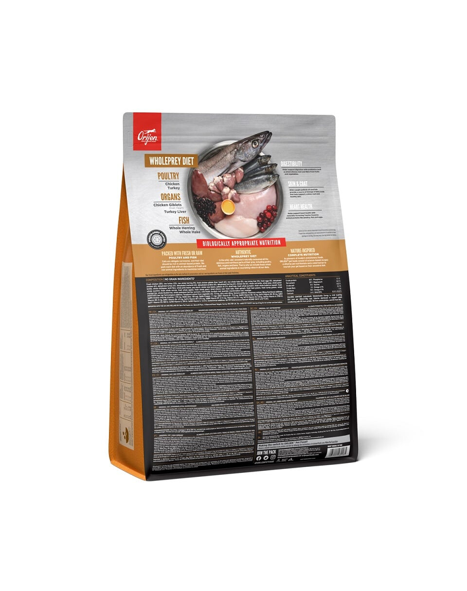 La formule innovante créée par les spécialistes d'Orijen est basée sur des produits animaux riches en protéines. Orijen Cat & Kitten est un aliment composé à 85 % de viande. Il s'agit notamment de viandes fraîches et entières de poulet, de dinde - leurs foies, et de poissons entiers et frais tels que le flet et le hareng. Ils sont complétés par des cœurs de dinde et de poulet. Les 15% restants de la composition sont constitués de fruits et légumes sélectionnés pour obtenir la dose maximale de vitamines et de substances complémentaires : carottes, pommes rouges, betteraves, canneberges, potiron en deux variétés, poires et myrtilles. La présence de la lavande et de l'églantier confère un arôme spécifique. Cet aliment est universel, c'est-à-dire qu'il convient aux chats qui passent la plupart de leur temps à l'intérieur, ainsi qu'à ceux qui mènent une vie active. Orijen ne contient pas de céréales, ce qui est encore plus efficace pour renforcer les réserves d'énergie de la vie quotidienne.