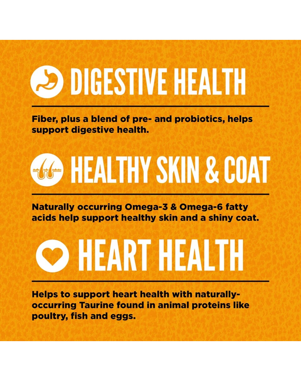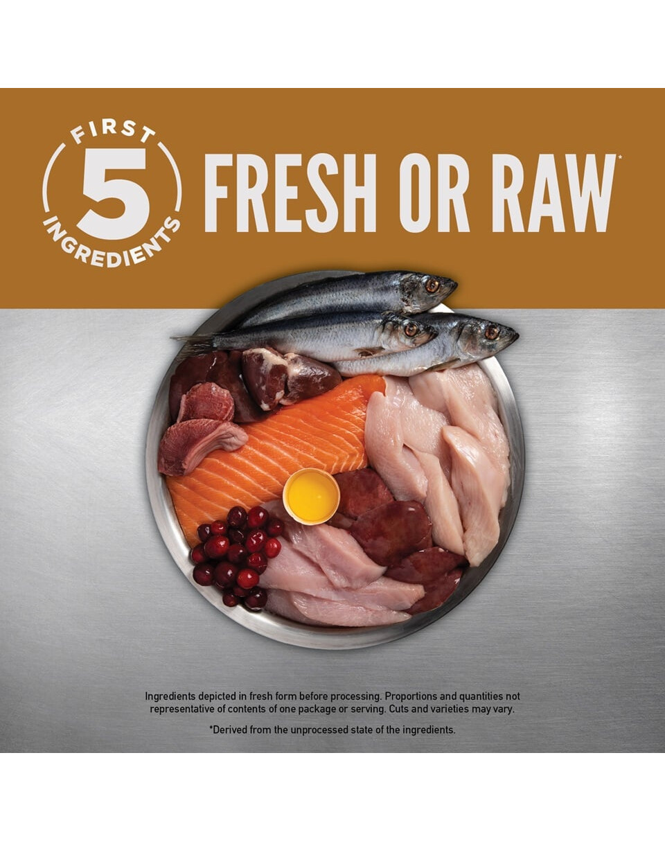 viande de poulet fraîche (18%), viande de dinde fraîche (7%), œufs entiers frais (5%), foie de poulet frais (5%), flet entier frais (4%), hareng entier frais (4%), foie de dinde frais (4%), cœur de poulet frais (4%), cœur de dinde frais (4%), cou de poulet frais (4%), poulet (déshydraté, 4%), dinde (déshydratée, 4%), maquereau entier (déshydraté, 4%), sardines entières (déshydratées, 4%), hareng entier (déshydraté, 4%), graisse de poulet (3%), lentilles rouges entières, pois verts entiers, lentilles vertes entières, pois chiches entiers, pois jaunes entiers, fibres de lentilles, haricots pinto entiers, haricots blancs entiers, cartilage de poulet (déshydraté, 1%), huile de hareng (1%), foie de poulet (lyophilisé), foie de dinde (lyophilisé), citrouille fraîche entière, melon musqué frais entier, courgettes fraîches entières, panais frais entiers, carottes fraîches, pommes red delicious fraîches entières, poires bartlett fraîches entières, chou frisé frais, épinards frais, feuilles de betterave fraîche, feuilles de navet frais, varech brun, airelles rouges entières, myrtilles entières, baies d'amélanchier entières, racine de chicorée, curcuma, chardon-marie, racine de bardane, fleur de lavande, racine de valériane, cynorrhodon. Additifs nutritionnels : zinc, cuivre, choline.
