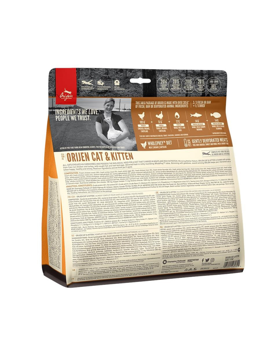 La formule innovante créée par les spécialistes d'Orijen est basée sur des produits animaux riches en protéines. Orijen Cat & Kitten est un aliment composé à 85% d'ingrédients carnés. Il s'agit de viandes fraîches et entières de poulet, de dinde - leur foie - et de poissons frais et entiers tels que la limande et le hareng. Ils sont complétés par des cœurs de dinde et de poulet. Les 15 % restants de la composition sont constitués de fruits et légumes sélectionnés pour obtenir une dose maximale de vitamines et de substances complémentaires - carottes, pommes rouges, betteraves, canneberges, potiron en deux variétés, poires et myrtilles. La présence de lavande et d'églantier apporte un arôme spécifique. L'aliment est universel, c'est-à-dire qu'il convient aux chats qui passent la plupart de leur temps à l'intérieur, ainsi qu'à ceux qui mènent un style de vie actif. Orijen ne contient pas de céréales, ce qui est encore plus efficace pour renforcer les réserves d'énergie de la vie quotidienne.