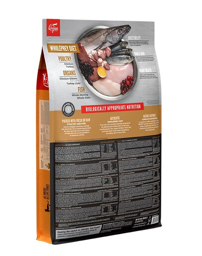Viande fraîche de poulet (20%), viande crue de dinde (10%), hareng entier cru (9%), organes frais de poulet (foie, cœur) (6%), merlu entier cru du Pacifique Nord (5%), foie cru de dinde (5%), œufs frais (5%), poulet déshydraté (4%), dinde déshydratée (4%), maquereau déshydraté (4%), sardine déshydratée (4%), hareng déshydraté (4%), graisse de poulet (4%), lentilles rouges entières, pois entiers, lentilles vertes entières, pois chiches entiers, fibres de lentilles, haricots pinto entiers, amidon de pois, haricots blancs entiers, huile de colin (1%), varech séché, citrouille fraîche entière, melon musqué frais entier, courgette fraîche entière, carottes fraîches entières, pommes fraîches entières, poires fraîches entières, racine de chicorée séchée, chou frisé frais, épinards frais, feuilles de betterave fraîches, feuilles de navet fraîches, canneberges entières, myrtilles entières, amélanches entières, curcuma, chardon-marie, racine de bardane, lavande, racine de valériane, cynorrhodon.
