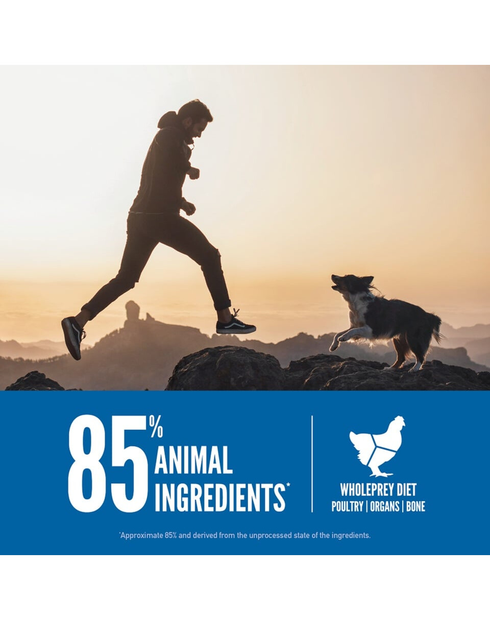 Viande de poulet fraîche (13%), viande de dinde fraîche (7%), œufs entiers frais (7%), foie de poulet frais (6%), hareng entier frais (6%), limande entière fraîche (5%), foie de dinde frais (5%), cou de poulet frais (4%), cœur de poulet frais (4%), cœur de dinde frais (4%), poulet (déshydraté), 4%), dinde (déshydratée, 4%), maquereau entier (déshydraté, 4%), sardines entières (déshydratées, 4%), hareng entier (déshydraté, 4%), lentilles rouges entières, lentilles vertes entières, pois verts entiers, fibres de lentilles, pois chiches entiers, pois jaunes entiers, haricots pinto entiers, haricots blancs entiers, huile de hareng (1%), graisse de poulet (1%), cartilage de poulet (1%), foie de poulet (lyophilisé), foie de dinde (lyophilisé), potiron entier frais, melon entier frais, courgette entière fraîche, panais entier frais, carottes fraîches, pommes rouges délicieuses entières fraîches, poires bartlett fraîches et entières, chou frisé frais, épinards frais, feuilles de betterave fraîches, feuilles de navet fraîches, varech brun, canneberges entières, myrtilles entières, amélanches entières, racine de chicorée, curcuma, chardon bénit, racine de bardane, fleur de lavande, racine de valériane, églantier