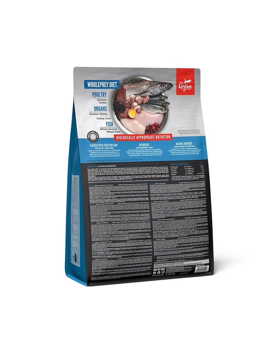Viande de poulet fraîche (13%), viande de dinde fraîche (7%), œufs entiers frais (7%), foie de poulet frais (6%), hareng entier frais (6%), limande entière fraîche (5%), foie de dinde frais (5%), cou de poulet frais (4%), cœur de poulet frais (4%), cœur de dinde frais (4%), poulet (déshydraté), 4%), dinde (déshydratée, 4%), maquereau entier (déshydraté, 4%), sardines entières (déshydratées, 4%), hareng entier (déshydraté, 4%), lentilles rouges entières, lentilles vertes entières, pois verts entiers, fibres de lentilles, pois chiches entiers, pois jaunes entiers, haricots pinto entiers, haricots blancs entiers, huile de hareng (1%), graisse de poulet (1%), cartilage de poulet (1%), foie de poulet (lyophilisé), foie de dinde (lyophilisé), potiron entier frais, melon entier frais, courgette entière fraîche, panais entier frais, carottes fraîches, pommes rouges délicieuses entières fraîches, poires bartlett fraîches et entières, chou frisé frais, épinards frais, feuilles de betterave fraîches, feuilles de navet fraîches, varech brun, canneberges entières, myrtilles entières, amélanches entières, racine de chicorée, curcuma, chardon bénit, racine de bardane, fleur de lavande, racine de valériane, églantier