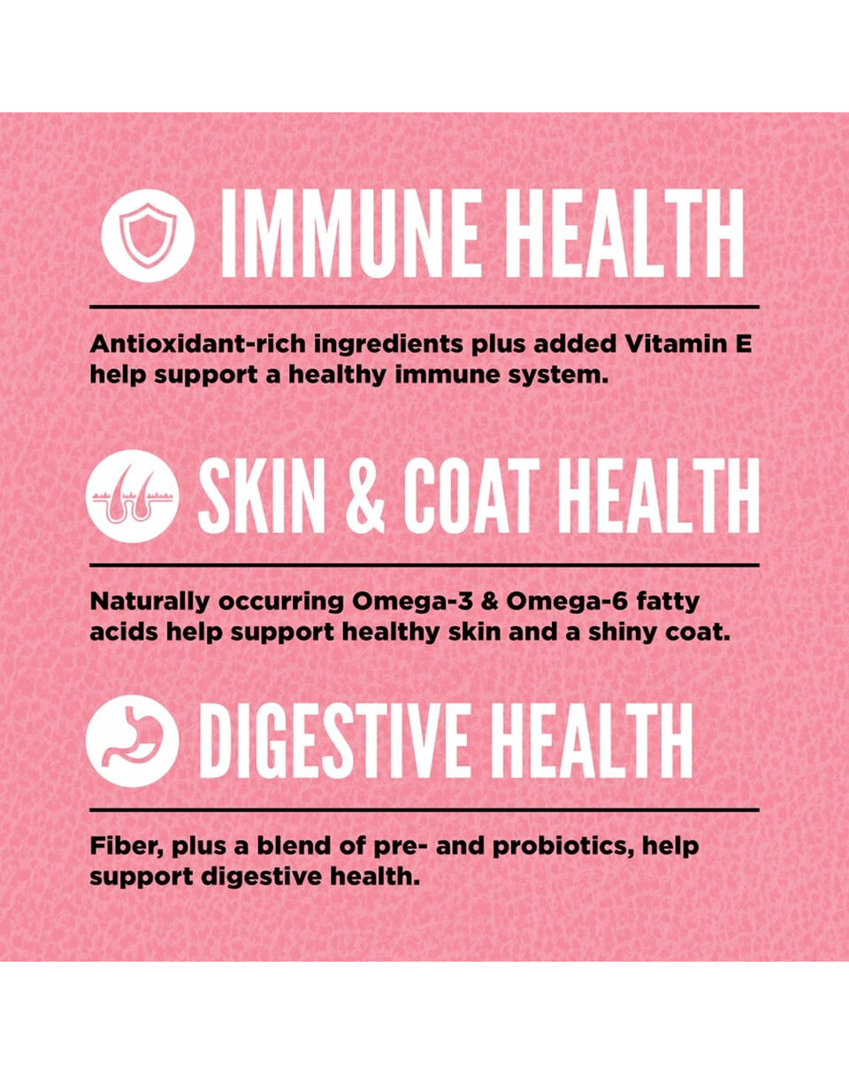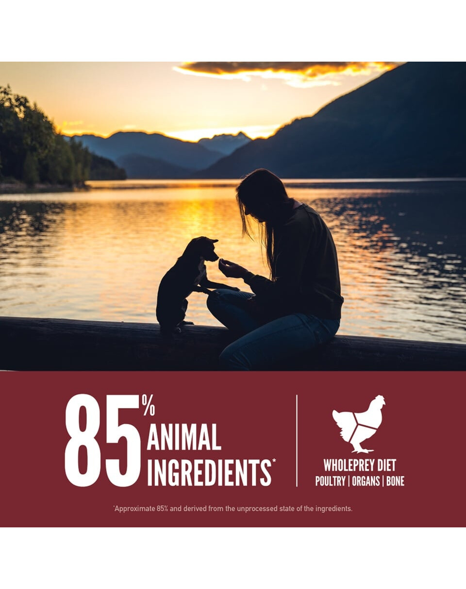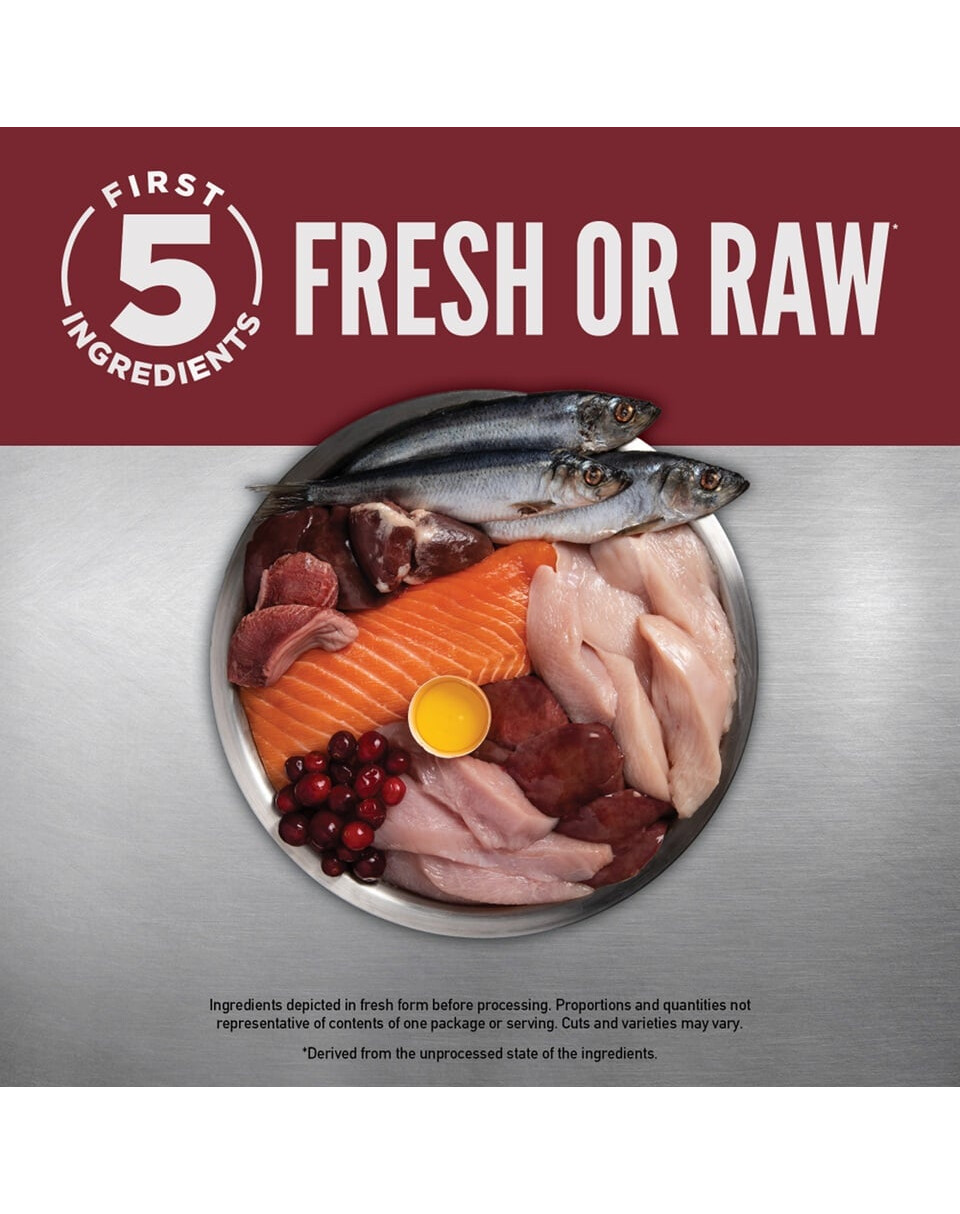 Viande de dinde fraîche (15 %), viande de poulet fraîche (13 %), viande de caille crue (4 %), œufs frais sans cage (4 %), sébaste entier cru (4 %), hareng entier cru (4 %), foie de dinde frais (4 %), foie de poulet frais (4 %), cœur de dinde frais (4 %), cœur de poulet frais (4 %), viande de dinde déshydratée (4 %), viande de poulet déshydratée (4%), hareng déshydraté (4%), foie de poulet déshydraté (4%), œufs déshydratés (4%), lentilles rouges entières, haricots pinto entiers, lentilles vertes entières, graisse de poulet (3%), haricots blancs entiers, pois chiches entiers, fibres de lentilles, pois entiers, cartilage de dinde (0.5%), cartilage de poulet (0,5%), huile de lieu jaune (0,5%), foie de poulet lyophilisé (0.5%), moules vertes de Nouvelle-Zélande, pastèque entière fraîche, potiron entier frais, sel, pommes fraîches, carottes fraîches, poires fraîches, courgettes fraîches, racine de chicorée, feuilles de betterave fraîche, chou frisé frais, épinards frais, feuilles de navet fraîches, myrtilles entières fraîches, canneberges entières fraîches, amélanches entières fraîches, racine de bardane, lavande, racine de valériane, chardon marie, églantier, racine de curcuma.