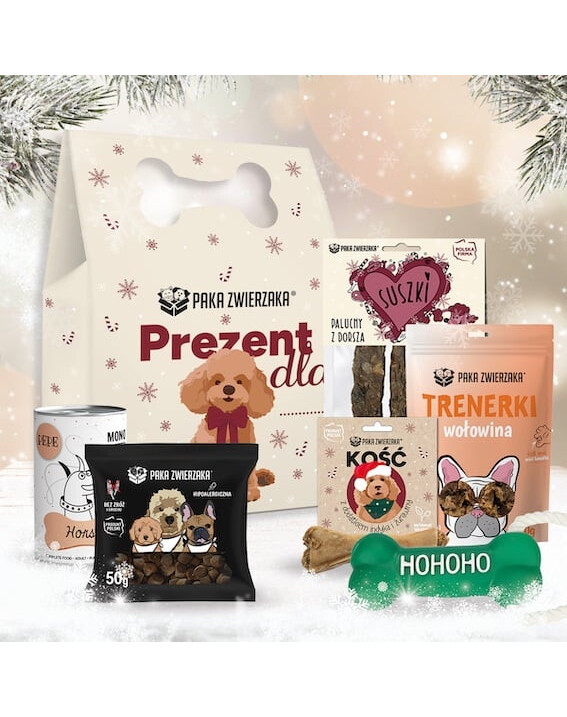 PAKA ZWIERZAKA Box de Noël pour chien est un ensemble cadeau exceptionnel rempli de friandises et de surprises qui feront que la queue de votre animal ne cessera de remuer !