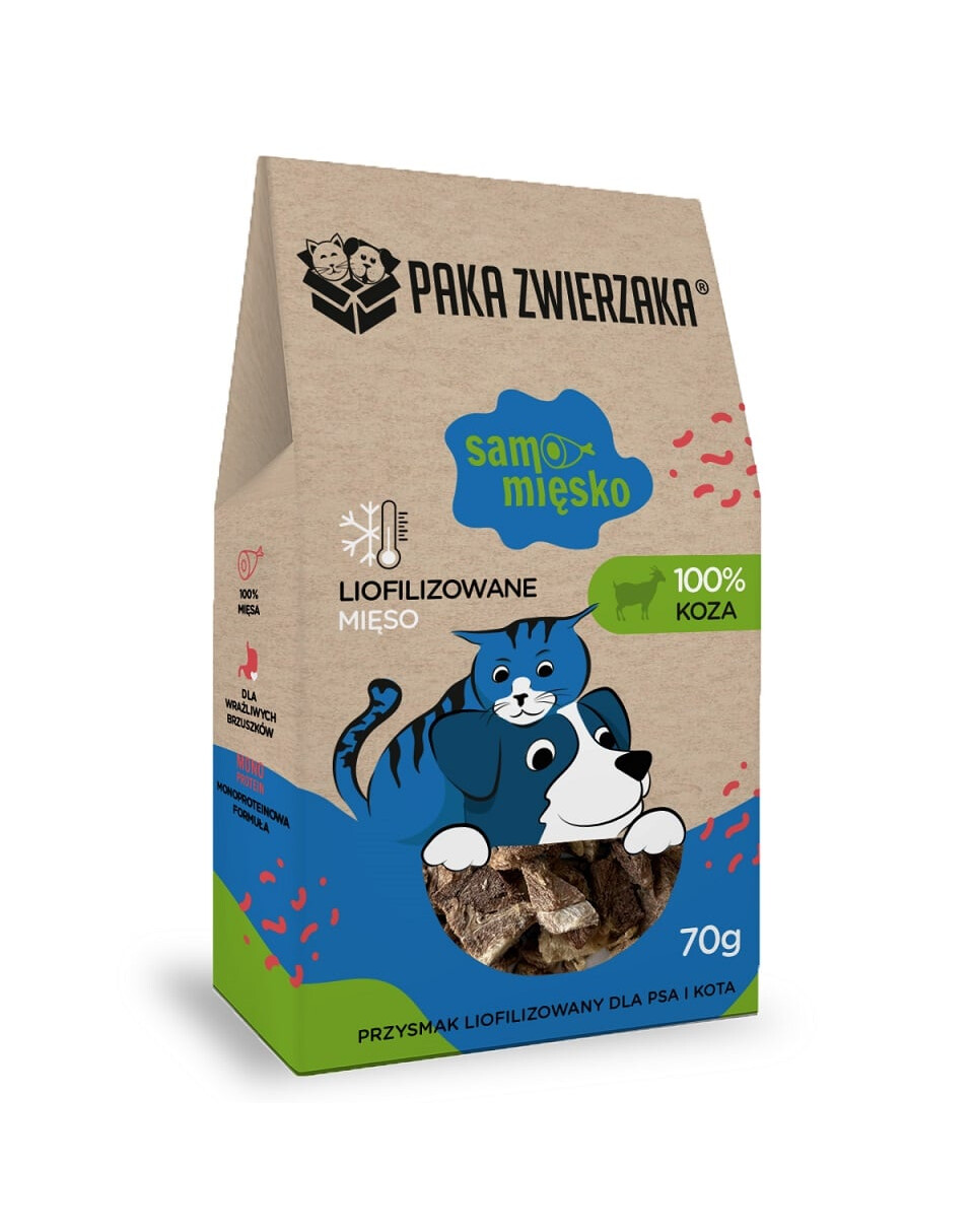 Viande Pure – 100% Chèvre est une friandise de haute qualité, monoingrédient pour chiens et chats, fabriquée uniquement à partir de viande de chèvre. Le produit ne contient pas de conservateurs, de colorants, de céréales ni d'additifs artificiels. Grâce au processus de lyophilisation, la viande conserve ses propriétés nutritionnelles naturelles, son goût et son arôme, qui séduiront même les animaux les plus exigeants.