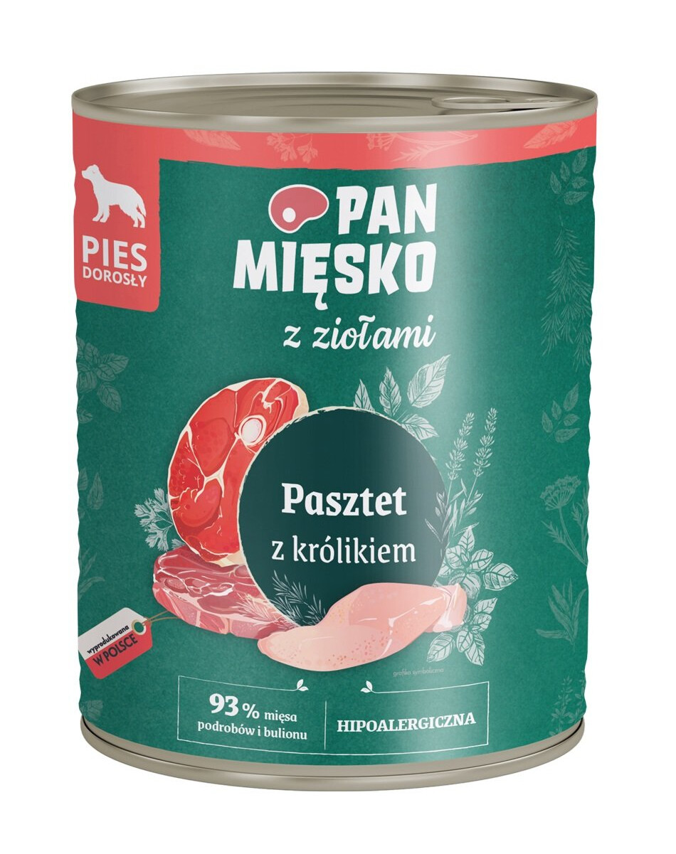 Pan Mięsko z ziołami est un pâté exceptionnel conçu pour les chiens adultes qui méritent un repas savoureux et nutritif chaque jour. La recette soigneusement élaborée avec du lapin et un mélange d'herbes aromatiques offre non seulement un goût délicieux, mais soutient également la santé et le bien-être de votre animal.