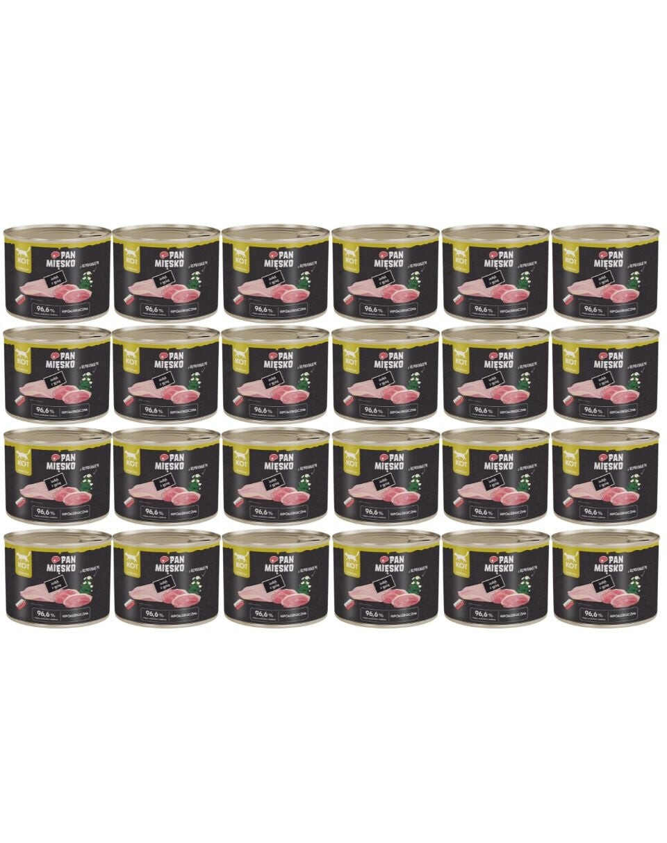Pan Mięsko est une nourriture humide premium conçue pour les chats adultes qui méritent une alimentation naturelle et nutritive chaque jour. Sa composition contient jusqu'à 96,6 % de viande, d'abats et de bouillon, garantissant un goût exceptionnel et une haute teneur en protéines animales facilement digestibles. La recette a été élaborée en Pologne par des experts en nutrition animale, dans le but de fournir au chat tout ce dont il a besoin pour une vie saine et active.