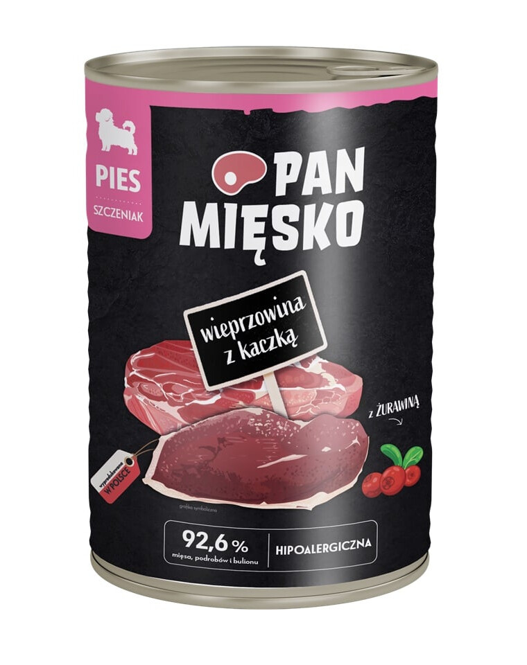 Découvrez les aliments humides de haute qualité pour chiens Pan Mięsko. Ils se distinguent par des viandes soigneusement sélectionnées, ajoutées de juteuses pommes polonaises et d'additifs précieux, comme des herbes ou des graines, qui ont un effet positif sur la santé et la condition de votre chien. Nos recettes ont été préparées par des spécialistes pour fournir à votre compagnon à quatre pattes exactement ce dont il a besoin. Votre chien mérite le meilleur.
