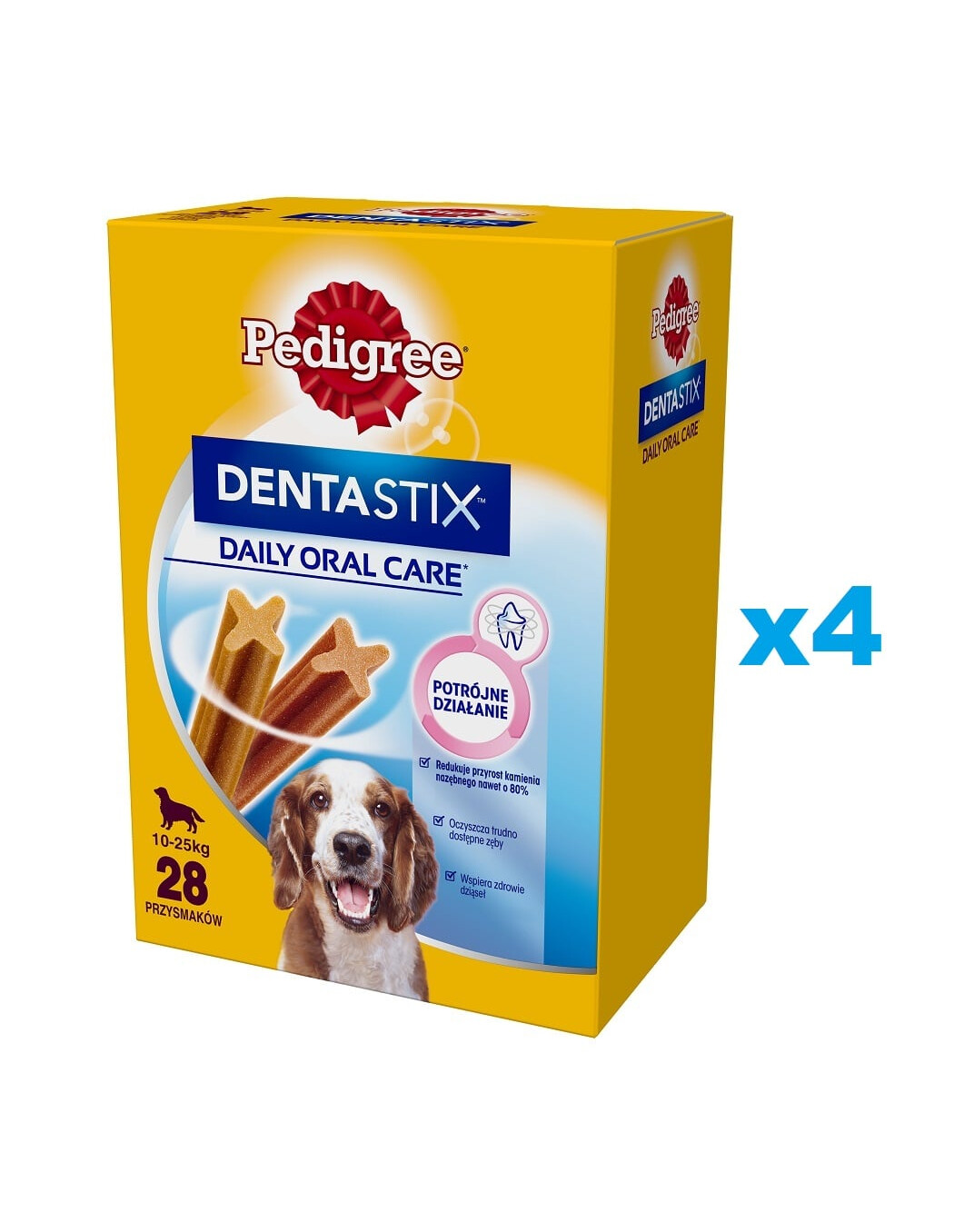 PEDIGREE DentaStix est une nourriture complémentaire pour les chiens âgés de plus de 4 mois. Ce format de friandise est exclusivement destiné aux chiens pesant entre 10 et 25 kg.