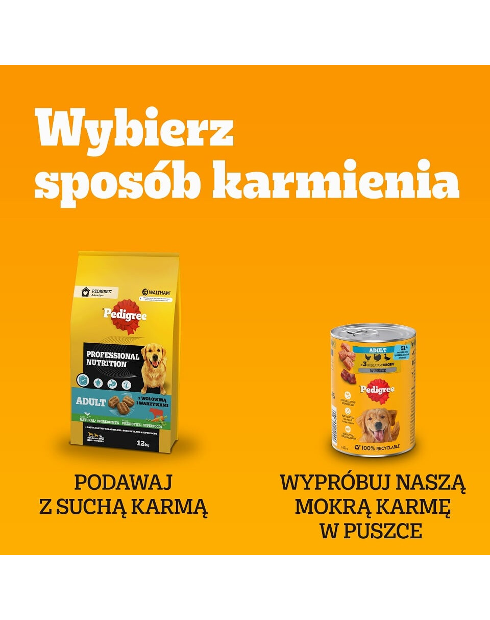 Nourriture humide PEDIGREE Adult Vitality+ avec légumes dans une sauce veloutée est un aliment complet destiné aux chiens adultes dans quatre délicieuses saveurs : avec bœuf et foie, carottes et petits pois, avec poulet et pommes de terre, avec poisson et carottes, avec volaille, carottes et petits pois. La recette a été développée par des vétérinaires et des spécialistes en nutrition de l'Institut WALTHAM pour la science animale et contient de la glucosamine, qui aide à maintenir des articulations saines, favorisant ainsi la mobilité. Les vitamines E et les antioxydants présents dans la composition ont des propriétés antioxydantes et soutiennent les mécanismes de défense naturels de votre chien. Les vitamines du groupe B et le zinc soutiennent une peau et un pelage sains, pour aider votre chien à se sentir et à avoir l'air bien. La nourriture PEDIGREE contient des fibres alimentaires naturelles et des prébiotiques qui aident à maintenir des intestins sains car chaque chien mérite un ventre en bonne santé.