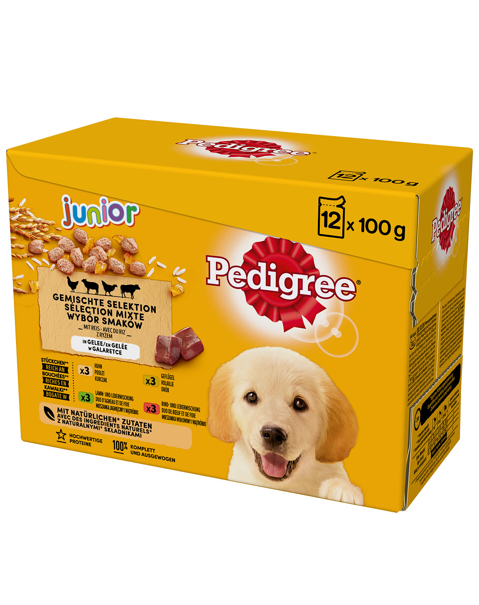 PEDIGREE Selection of Flavours with Rice in Jelly est un repas complet pour les chiens en pleine croissance, développé par les vétérinaires et les nutritionnistes du WALTHAMTM Institute of Animal Science. Les morceaux de viande riches en protéines, trempés dans une gelée savoureuse, satisferont les goûts des chiens les plus exigeants. Spécialement formulé sans arômes artificiels ni conservateurs, il contient des ingrédients naturels, des vitamines et des minéraux. La vitamine E contenue dans l'aliment soutient le système immunitaire de votre animal. Les fibres alimentaires soutiennent la fonction intestinale pour assurer une bonne digestion et, grâce aux calories réduites*, vous prendrez soin de sa minceur. Le paquet contient 4 saveurs : 3x morceaux riches en poulet, 3x morceaux riches en volaille, 3x morceaux riches en mélange d'agneau et de foie et 3x morceaux riches en mélange de bœuf et de foie.