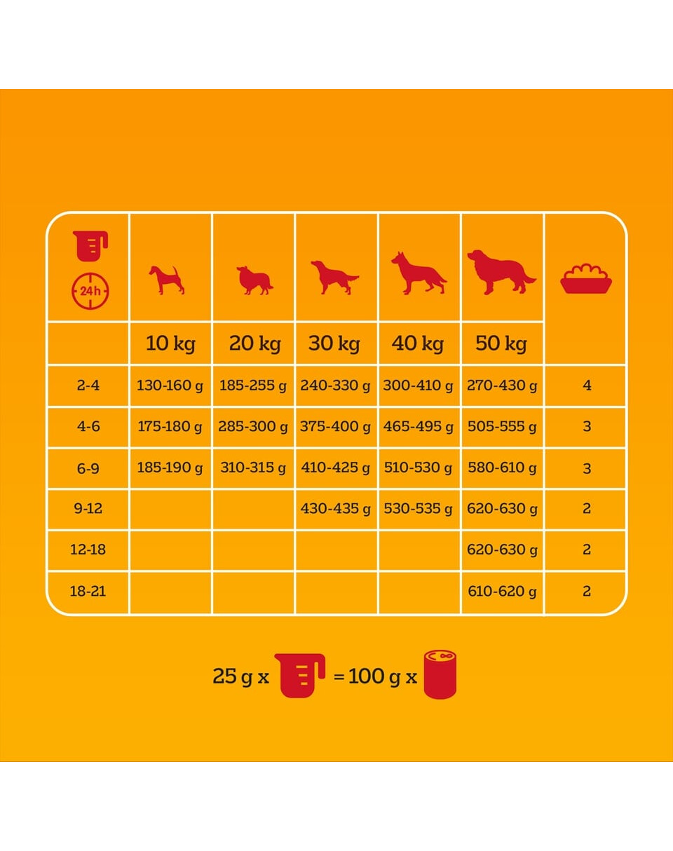 Environ 25 g de nourriture sèche peuvent être remplacés par 100 g de nourriture humide PEDIGREE.