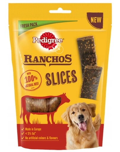 Les PEDIGREE® RANCHOS™ Slices constituent de délicieux en-cas pour votre chien, que ce soit lors d'une promenade, lorsqu'il joue avec lui à la maison ou pendant le dressage. Elles constituent un complément sain à l'alimentation quotidienne de votre chien. Dans le but de fournir la meilleure nutrition possible à votre chien, les RANCHOS™ Slices ont été développées par des nutritionnistes et des vétérinaires du WALTHAM™ Institute of Animal Science. Les ingrédients de la plus haute qualité sont utilisés pour leur production - les appétissantes PEDIGREE® RANCHOS™ Slices contiennent du foie de bœuf 100 % naturel. Il n'y a pas d'arômes ou de colorants artificiels dans la composition de ces friandises pour chiens.