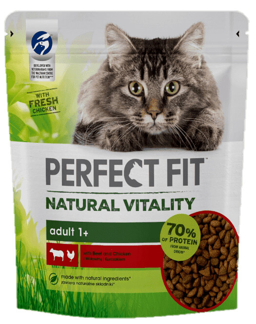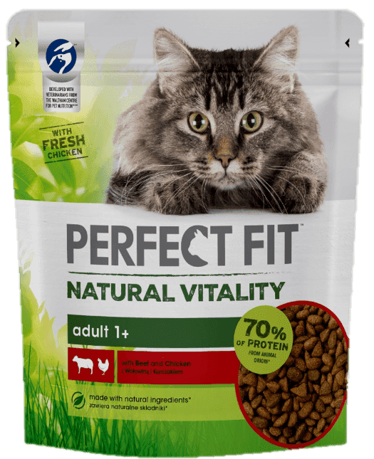Si vous vous demandez quoi donner à votre chat tous les jours, optez pour les croquettes PERFECT FIT Natural Vitality 1+ au bœuf et au poulet. Sa recette unique a été développée par des vétérinaires et des nutritionnistes du WALTHAM Institute of Animal Science. Conformément aux besoins nutritionnels des carnivores impitoyables que sont les chats, les croquettes PERFECT FIT Natural Vitality pour chats au bœuf et au poulet se caractérisent par leur teneur élevée en protéines animales. Elles favorisent le développement musculaire et fournissent les acides aminés nécessaires à une vie saine. PERFECT FIT Natural Vitality 1+ au boeuf et au poulet se distingue par sa teneur élevée en ingrédients d'origine naturelle, qui répondent aux besoins nutritionnels du chat inhérents à sa nature.