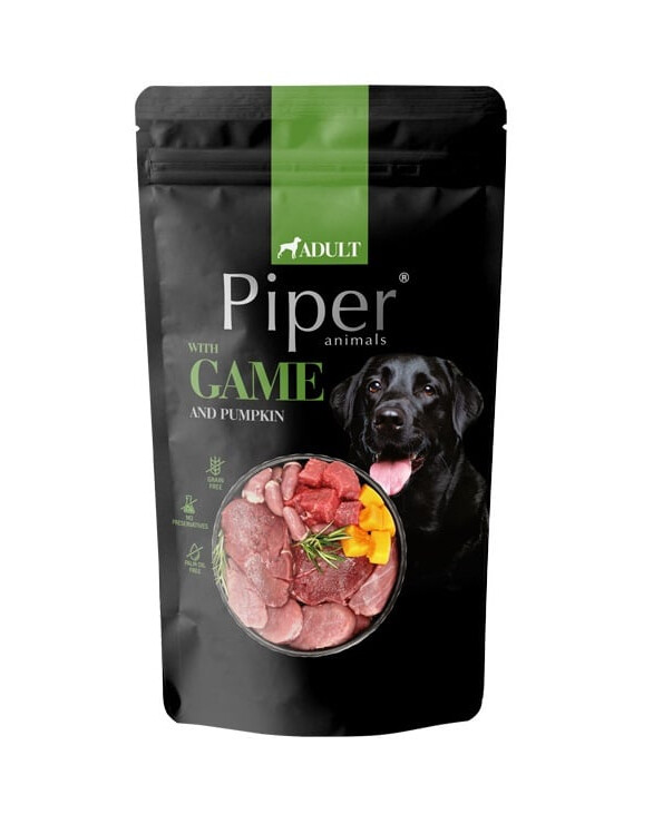 Nourriture humide complète pour chiens adultes de toutes races avec de la viande de gibier et de la citrouille.