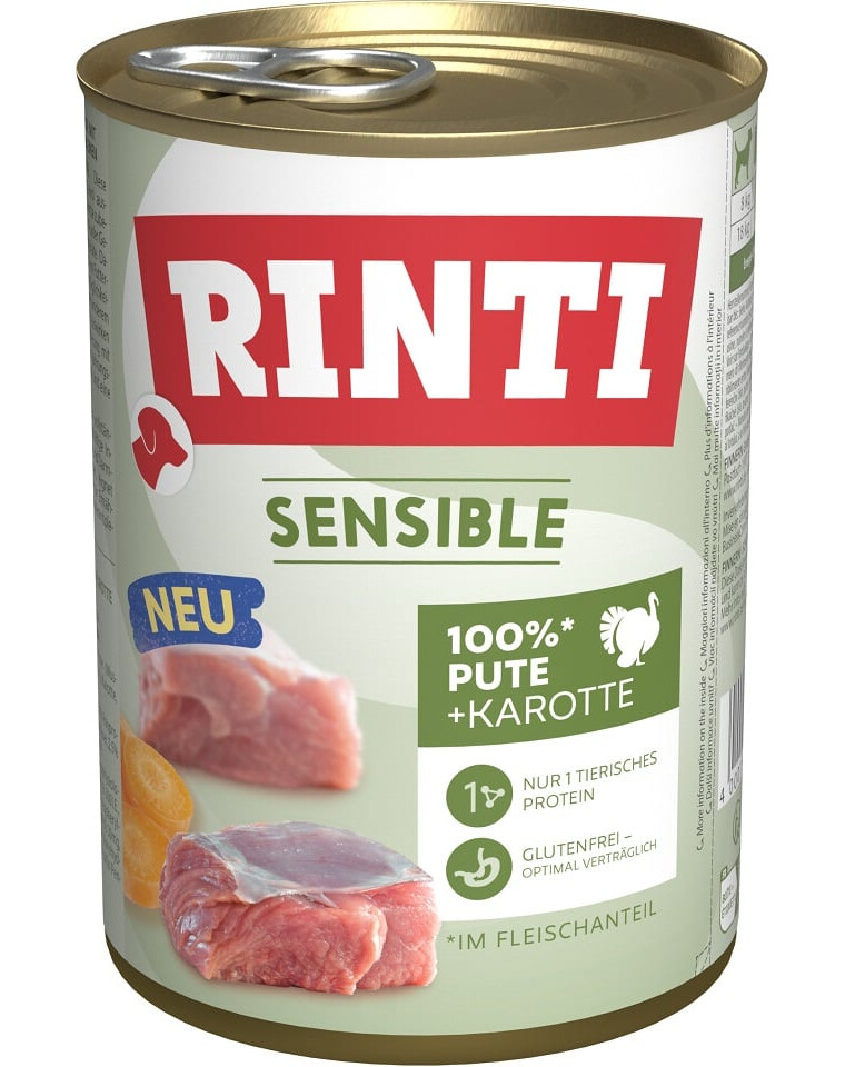 RINTI Sensible est un aliment complet de haute qualité préparé exclusivement avec de la dinde et des carottes. Il ne contient pas d'autres viandes, de céréales ou d'hydrates de carbone. Cela peut réduire le risque d'allergies et d'intolérances alimentaires, qui peuvent notamment affecter la peau et le pelage. L'enrichissement en carottes améliore l'utilisation de la nourriture et les hydrates de carbone constituent une source d'énergie pauvre en graisses. Les aliments Rinti Sensible conviennent également à l'alimentation des chiens souffrant d'une intolérance au gluten, car ils ne contiennent pas de gluten, qui peut entraîner des problèmes d'estomac et d'intestin.