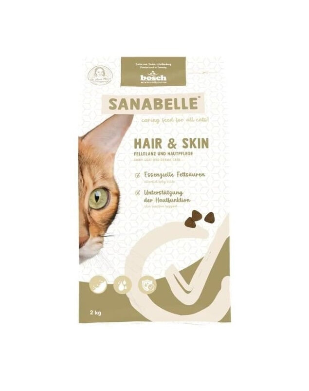 Sanabelle Hair & Skin est une alimentation complète pour chats adultes, conçue pour améliorer la condition de la peau et du pelage. Grâce à la présence d'acides gras essentiels omega-3 et omega-6, elle soutient la densité et la brillance naturelle du pelage – particulièrement chez les chats à poils longs. L'huile et la farine de saumon, les graines de lin et les ajouts végétaux, tels que la canneberge et les baies, renforcent l'immunité et protègent les cellules contre le stress oxydatif. La haute digestibilité de l'alimentation permet une bonne assimilation des ingrédients, et le chat profite d'une santé et d'une énergie chaque jour.