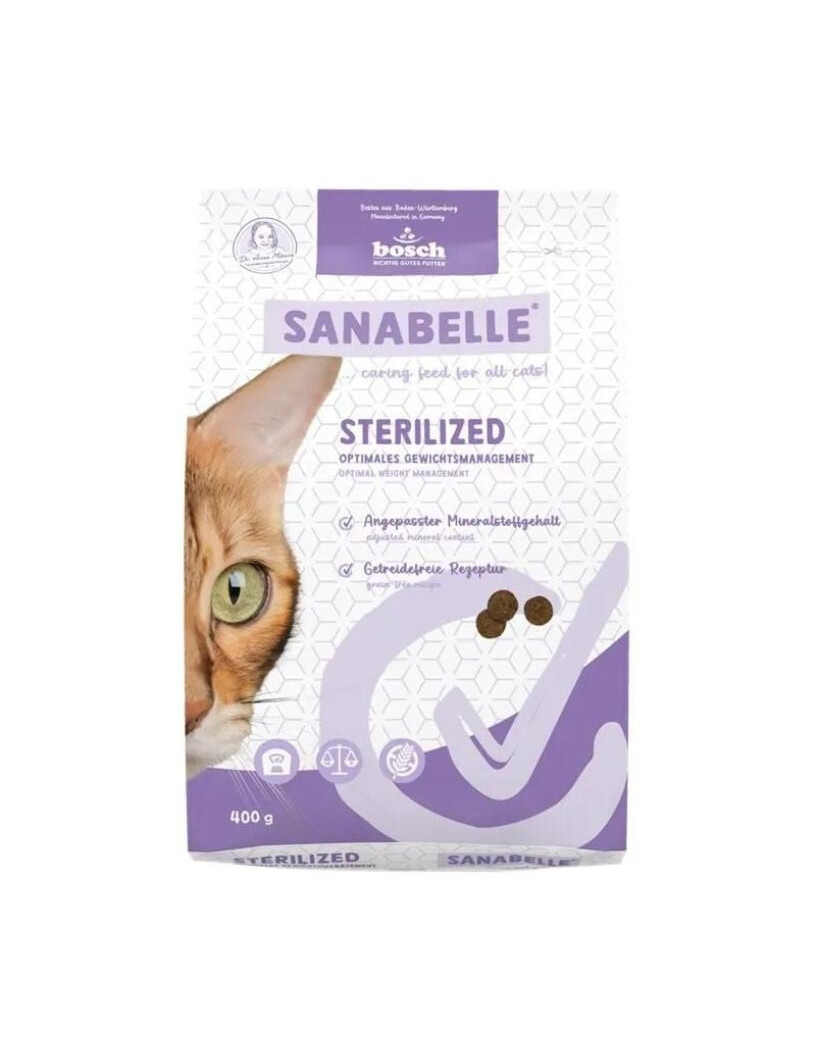 Sanabelle Sterilized est une nourriture sèche spécialisée pour les chats stérilisés et castrés, qui ont une tendance accrue à prendre du poids. Grâce à sa faible teneur en calories et à sa haute teneur en fibres, cet aliment aide à contrôler le poids tout en assurant une sensation de satiété après le repas.