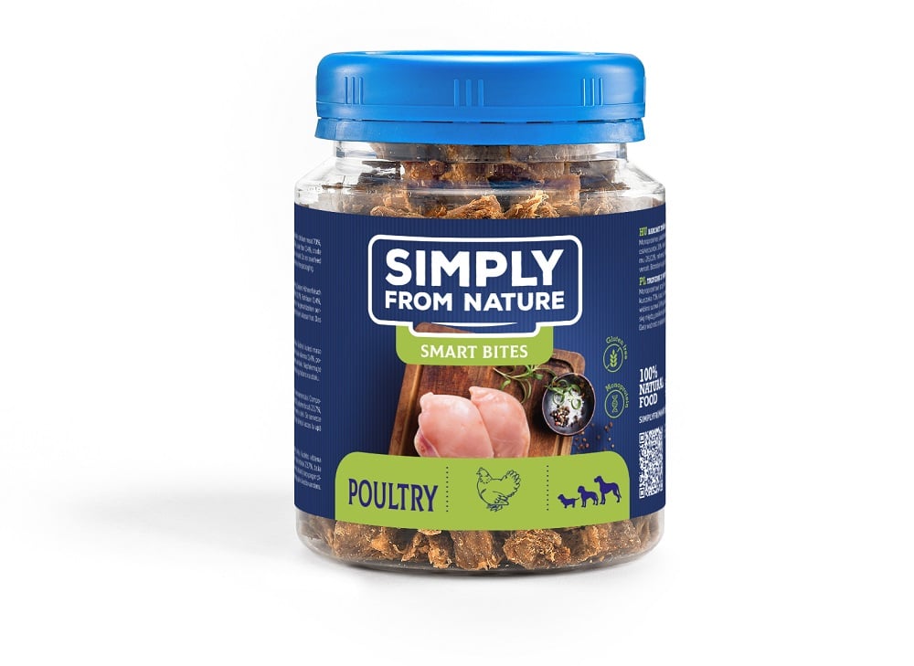 Friandises de viande, monoprotéinées et sans céréales de Simply from Nature. Elles rendent chaque entraînement et jeu avec votre chien plus facile et plus agréable ! Le parfum séduisant des friandises de volailles encourage le chien à effectuer des tâches.