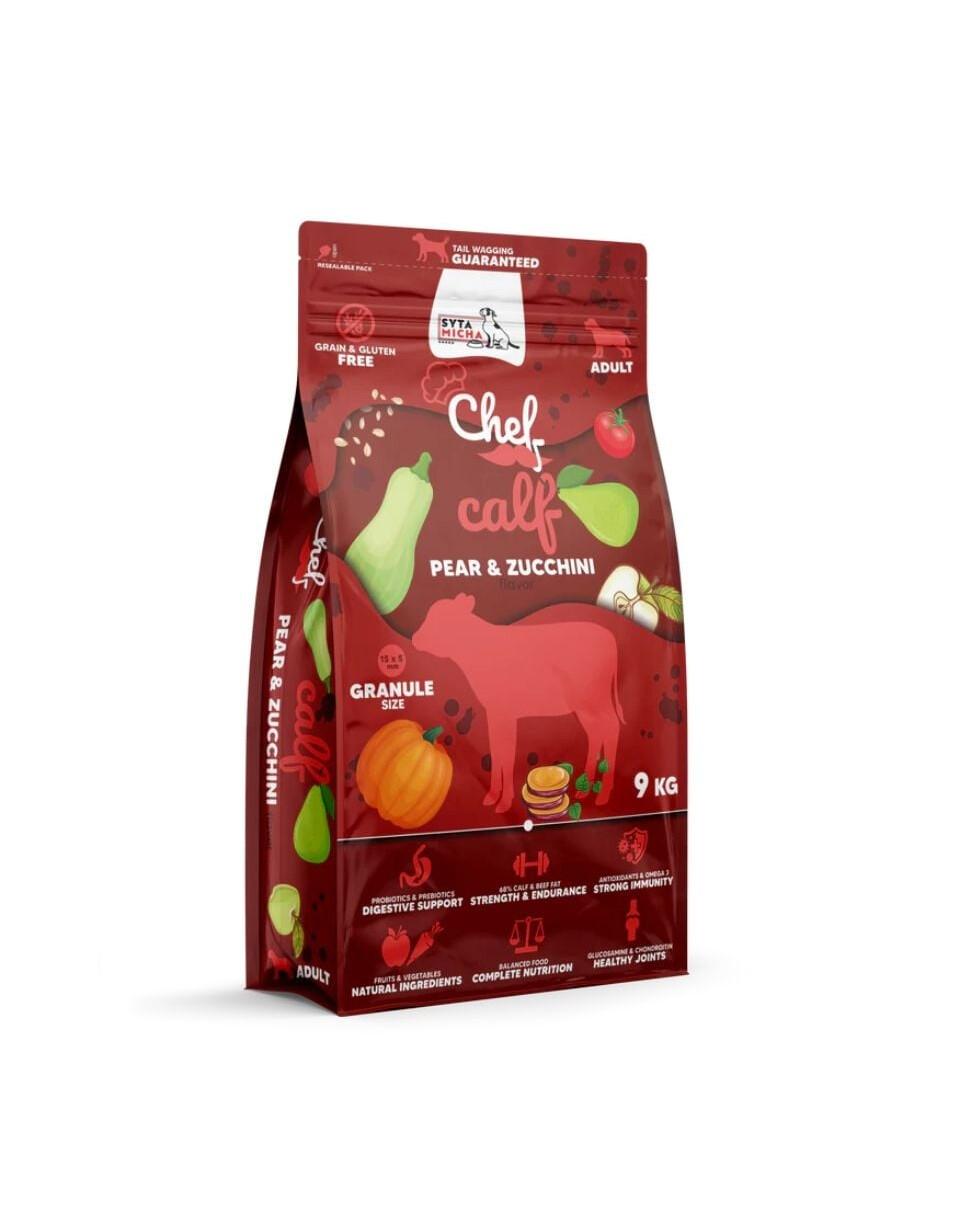 Ingrédients : viande de veau fraîche 30%, viande de veau séchée 30%, patate douce séchée 26%, graisse de boeuf 8%, pomme 1%, minéraux, poire 1%, citrouille 0.5%, graines de courge 0.4%, courgette 0.3%, pulpe de tomate 0.2%, farine de luzerne 0.1%, levures de brasserie séchées 0.1%, spiruline 0.1%, extrait de thé vert 0.05%, romarin 0.05%, sulfate de glucosamine 0.004%, sulfate de chondroïtine 0.002%, omega3 0.001%, extrait de yucca Schidigera 0.001%, produit de fermentation séché Enterococcus faecium 0.001%