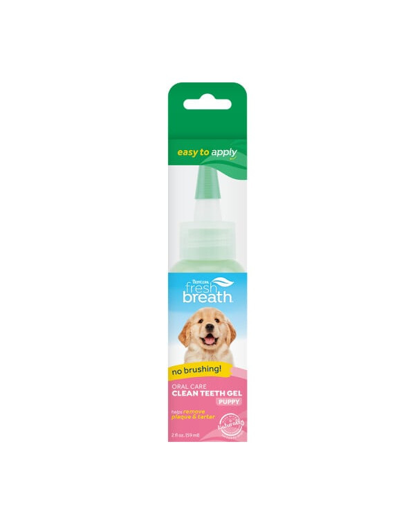 TropiClean Fresh Breath Oral Care Clean Teeth Gel for Puppies contribue à la santé bucco-dentaire des chiots et leur donne une haleine fraîche - sans brossage ! Ce gel savoureux, aromatisé à la menthe, aide à protéger les chiots contre l'accumulation de plaque dentaire tout en rafraîchissant leur haleine.