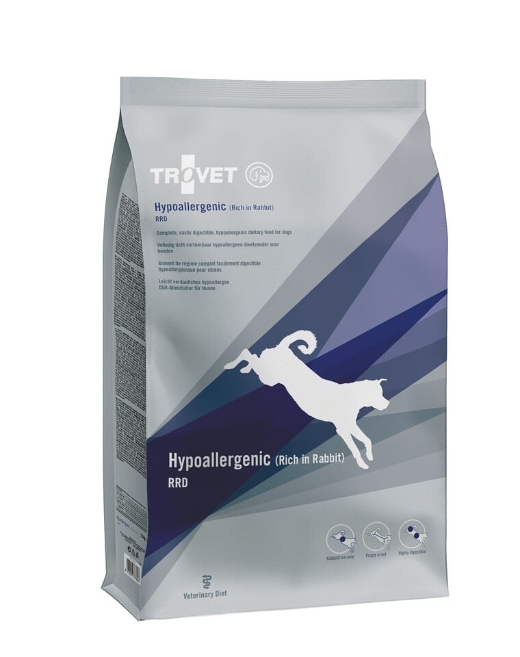 La durée recommandée d'utilisation de la nourriture hypoallergénique TROVET RRD (à base de viande de lapin) est de 3 à 8 semaines - après cette période, une fois les symptômes d'intolérance/sensibilité alimentaire disparus, la nourriture RRD peut continuer à être donnée au chien comme aliment complet.