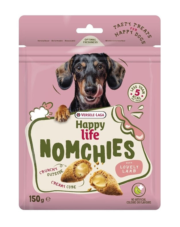 Happy Life NOMCHIES avec AGNEAU MIGNON pour une friandise croustillante pour chien avec une garniture crémeuse.