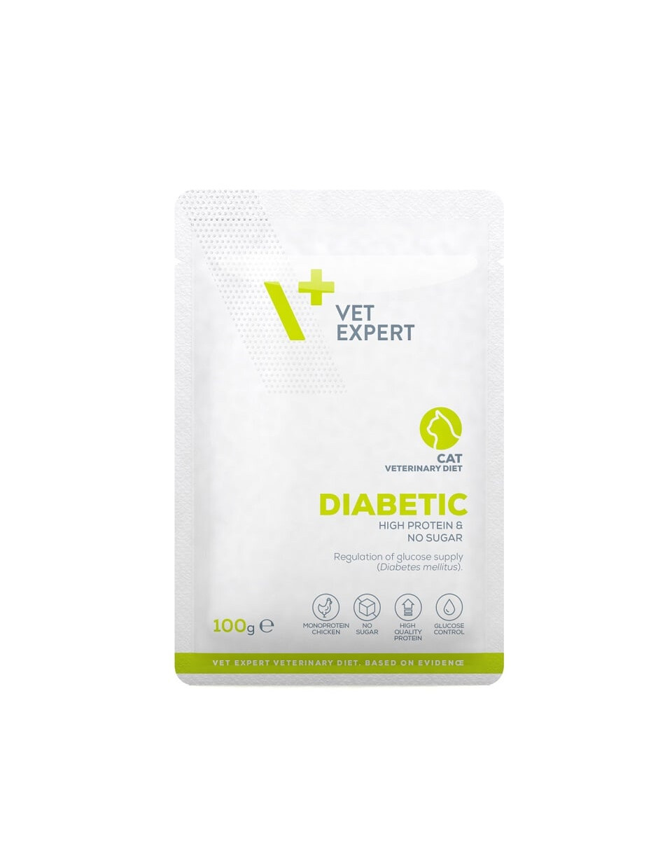 VET EXPERT Veterinary Diet Cat Diabetic est destiné aux chats adultes atteints de diabète (diabète sucré). L'aliment est pauvre en sucres simples, en disaccharides et en amidon pour aider à réguler le taux de sucre dans le sang. Les protéines animales de haute qualité fournissent tous les acides aminés dont votre chat a besoin.