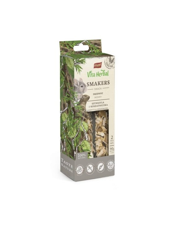 Vita Herbal Smakers est une friandise 100 % sans céréales, idéale pour les chinchillas et les cochons d'Inde. Comme son nom l'indique, le produit est composé d'écorces et de brindilles d'arbres à feuilles caduques. Elle agit comme une mastication naturelle pour un bon broyage des incisives, et la structure dure de la friandise favorise encore plus ce processus. En outre, les brindilles et l'écorce sont une excellente source de fibres et ont un effet bénéfique sur le système digestif de l'animal, soulageant les symptômes de la diarrhée et du catarrhe intestinal. Les Smakers ne contiennent ni sucre ajouté ni miel.