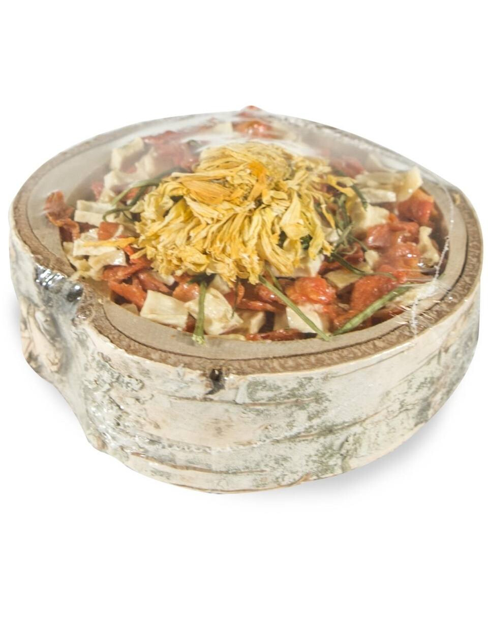 bois de bouleau séché, carotte séchée, panais séché, tige de persil séchée, fleur de souci séchée, amidon.