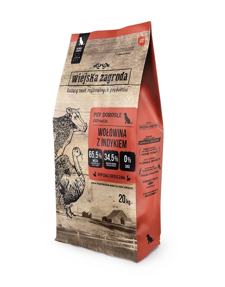 WIEJSKA ZAGRODA Bœuf et dinde est un aliment complet pour les chiens de grandes races.
