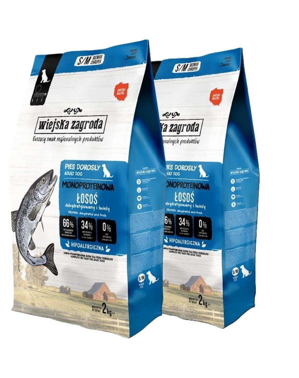 Wiejska Zagroda en version monoprotéique avec saumon est un choix idéal pour les chiens adultes ayant tendance aux allergies, un système digestif sensible ou des problèmes de peau. La recette repose sur une seule source de protéine animale – le saumon – ce qui limite le risque de réactions allergiques et d'intolérances alimentaires. La nourriture ne contient pas de céréales, de gluten, de légumineuses ni de poulet, mais fournit de l'énergie à partir de patates douces et de pommes de terre – des sources naturelles et facilement digestibles de glucides.