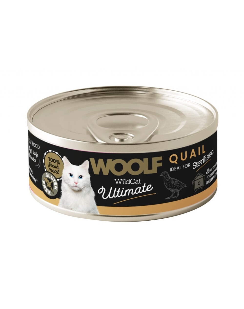 WOOLF Ultimate Cat Adult Sterilised Quail est une alimentation humide complète, sans gluten, sous forme de pâté délicat, conçue pour les chats adultes après une opération de stérilisation ou de castration. L'ingrédient principal est la caille – une viande juteuse, facilement digestible et riche en nutriments essentiels, soutenant le bon fonctionnement de l'organisme et le maintien d'un poids corporel optimal.
